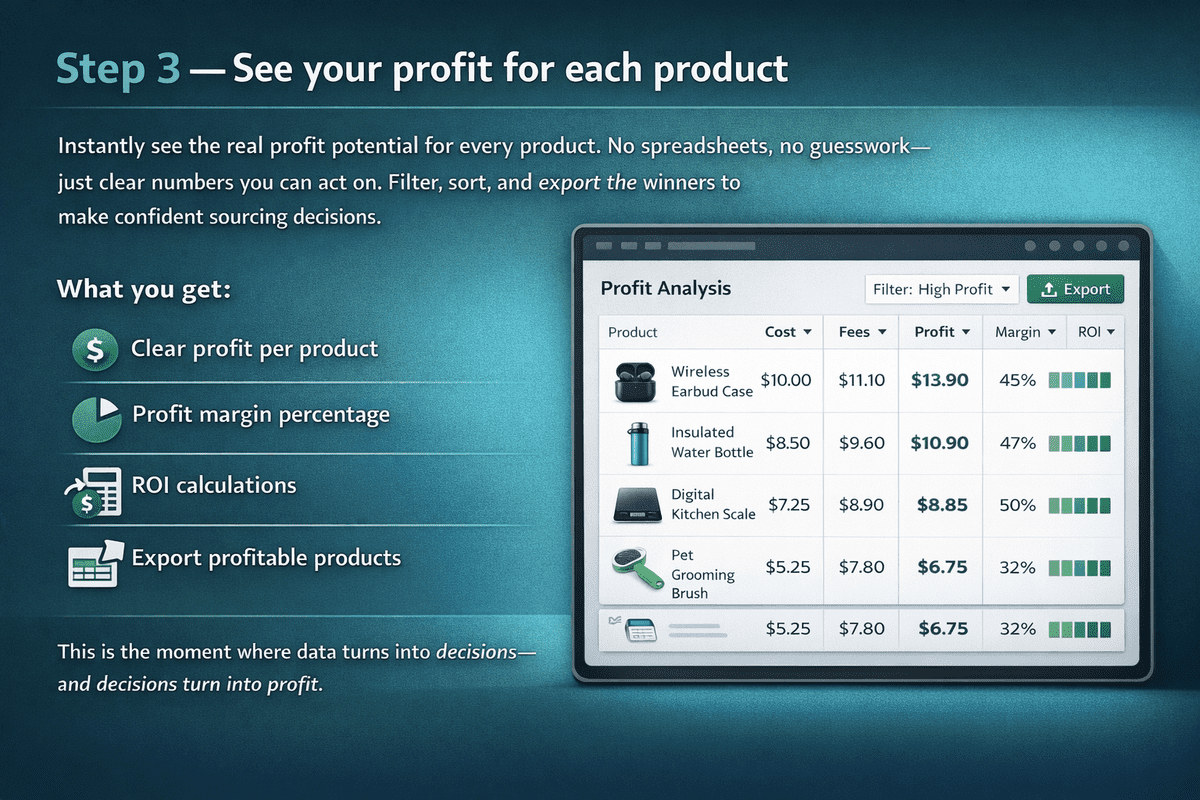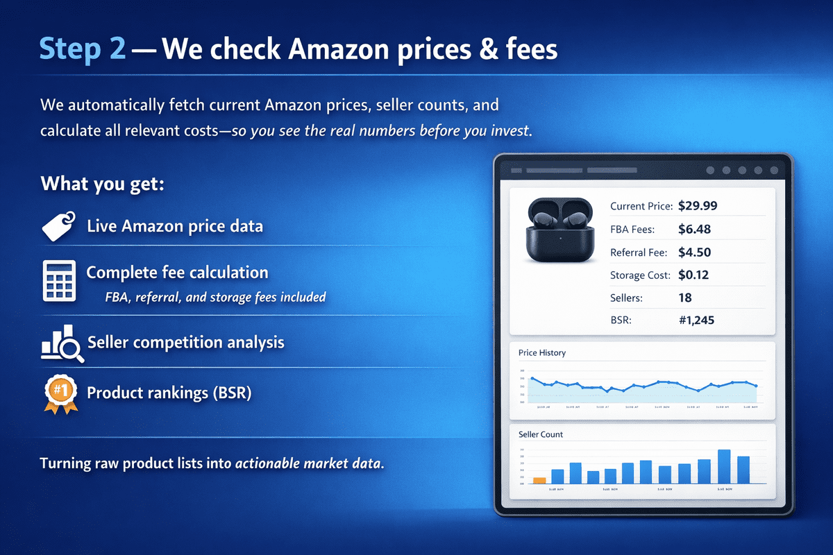 Upload your products, we check Amazon prices and fees, you see your profit instantly.